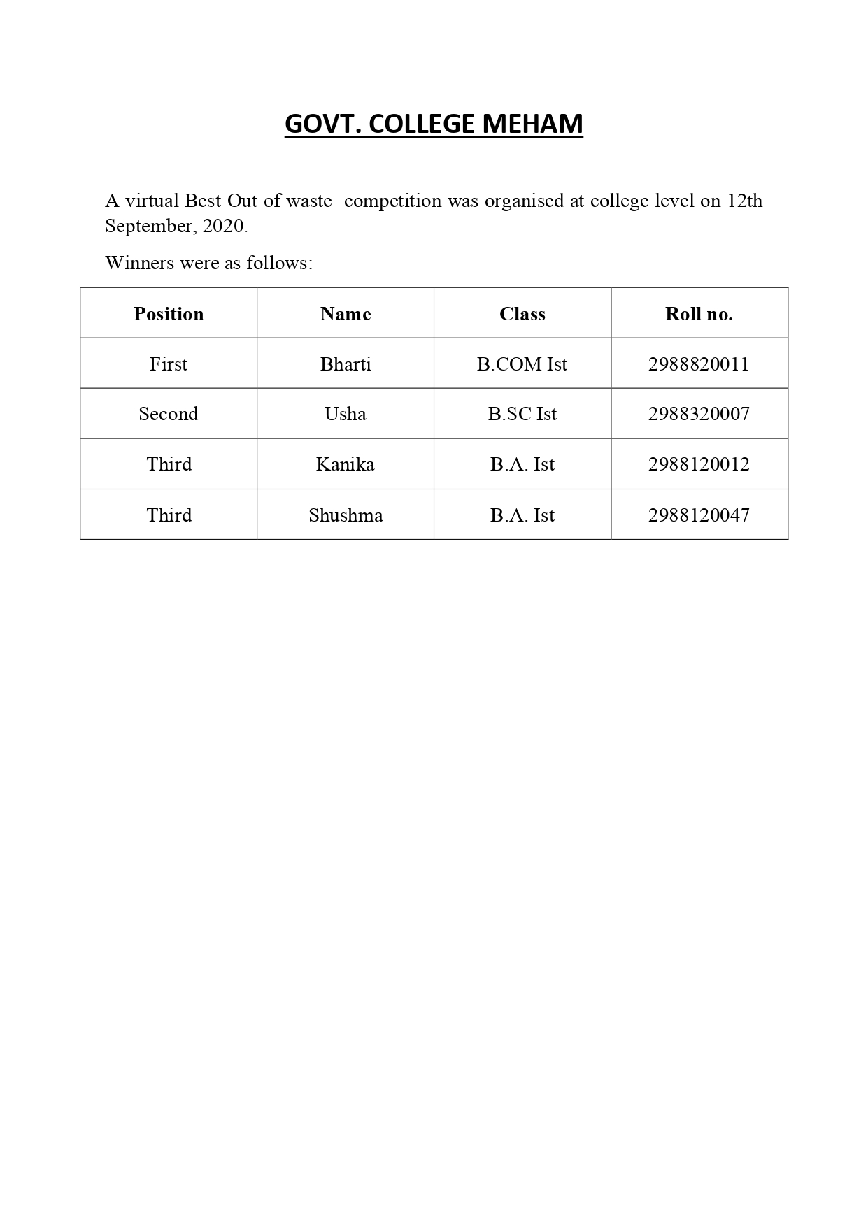 Results of a “Virtual Best Out of Waste Competition” held on 12th September, 20...